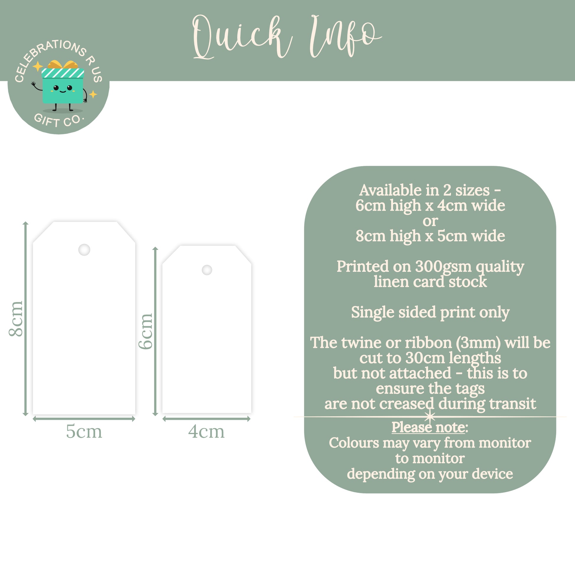 Printed in-house with care, the design is crisp and clear with soft green foliage accents that complement neutral and earthy tones. Every tag comes pre-punched and ready to use, saving you time while adding a beautiful handmade feel to your décor.