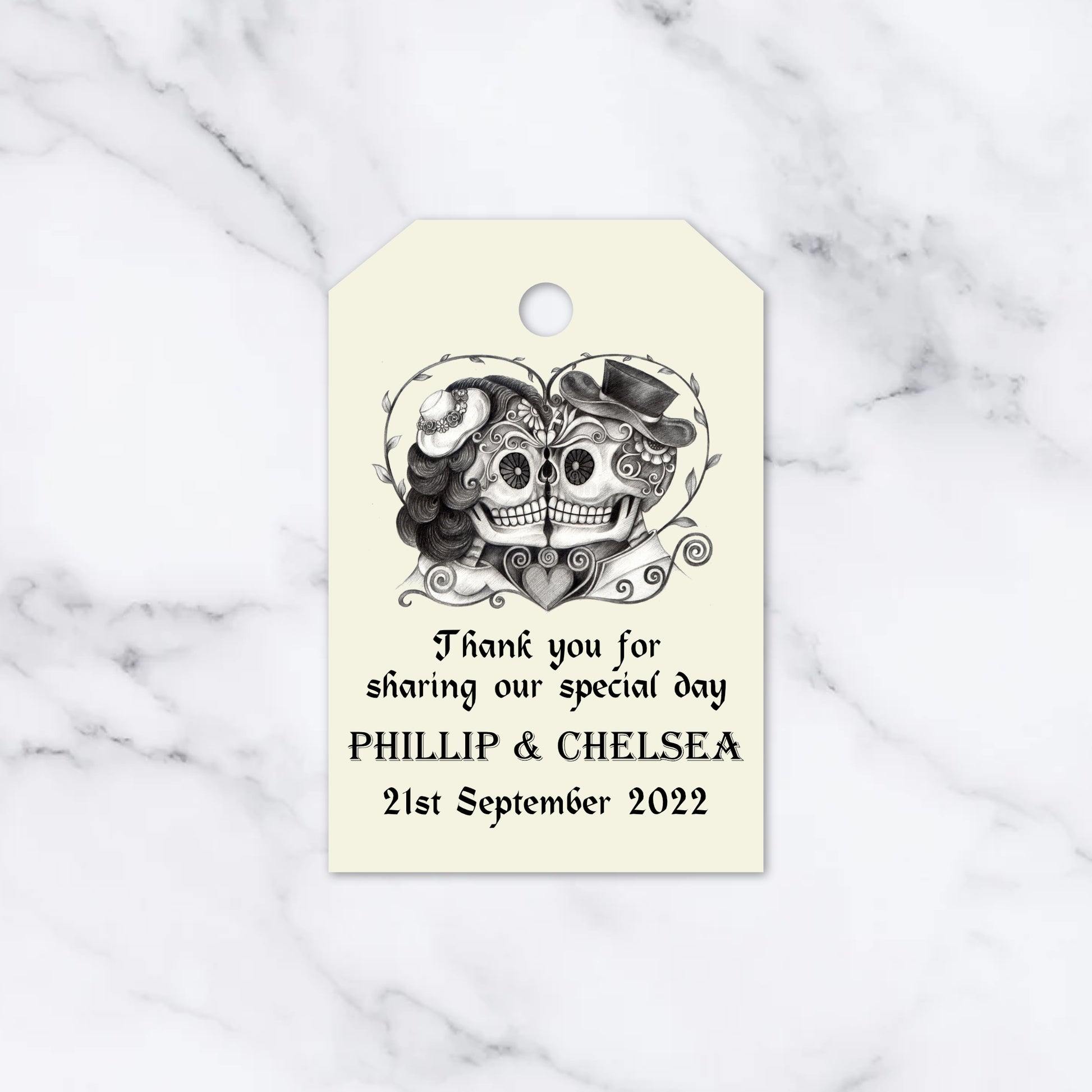 Each tag is professionally printed on premium cardstock with your chosen names and wedding date, creating a keepsake that reflects your style and personality. The striking heart skull illustration symbolises everlasting love — a beautiful nod to devotion that lasts beyond a lifetime. Designed to suit gothic weddings, moody floral themes, or unconventional celebrations, these tags make even the smallest favours stand out.