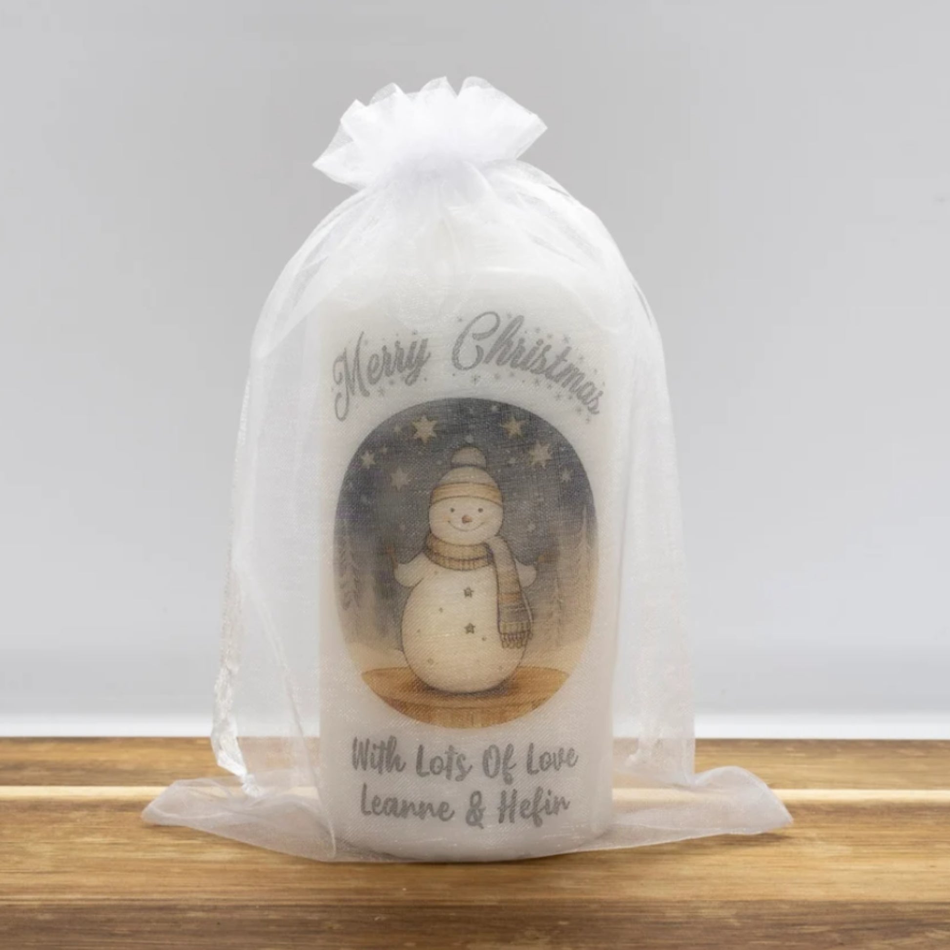 PERSONALISED SILVER SNOWMAN CHRISTMAS CANDLE